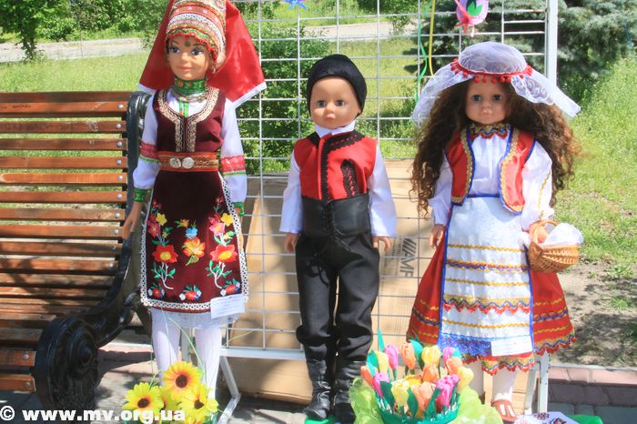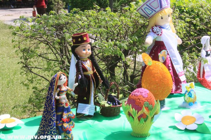 На площади возле фонтана еще одна большая выставка – от воспитанников детских садов нашего города. Тут и коллективные работы, и, так сказать, сольные. Посвящена выставка Пасхе. Но пасха сегодня интеркультурная, и дошколята решили не отходить от тематики. Среди разнообразия рисунков, писанок, пасок и яиц, выполненных в разных техниках, расположились куклы, одетые в костюмы разных национальностей.