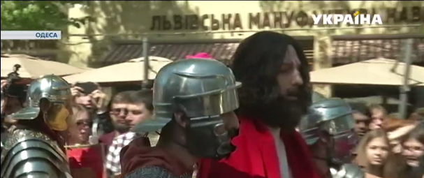 В центре города показали знаковые сцены: предательство Иуды, заговор первосвященников, встреча с Иродом и суд Понтия Пилата. Крестный путь – по брусчатке по Дерибасовской. Актеры и реконструкторы уже в седьмой раз приезжают на это действо в Одессу. В этом году – около четырехсот из всех областей и даже из-за границы. Рыбаки, купцы, крестьяне и придворные – все в изысканных костюмах того времени. Сопровождали их римские легионеры в полном боевом облачении.