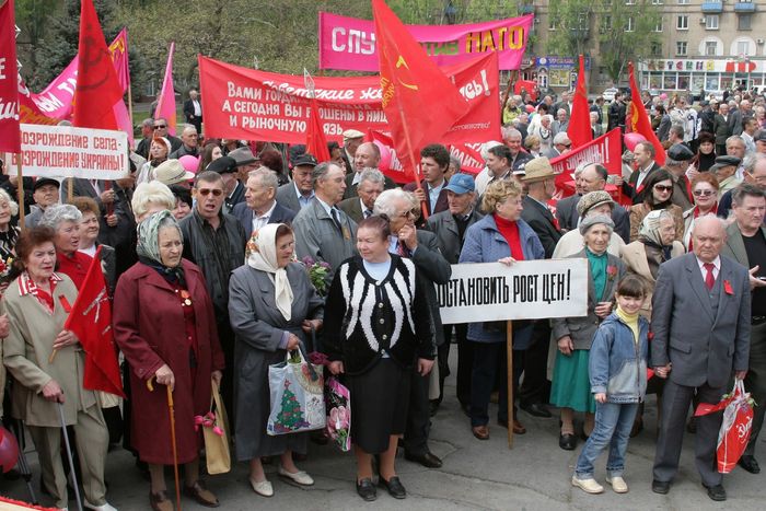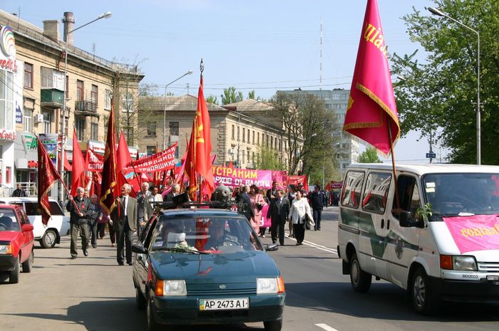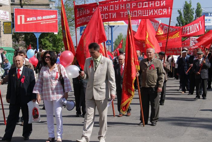 Год, когда в стране накалилась политическая ситуация. Это отразилось и на майских фото в Мелитополе. Многие горожане вышли тогда на митинг с российскими флагами. Коммунисты также не остались в стороне.