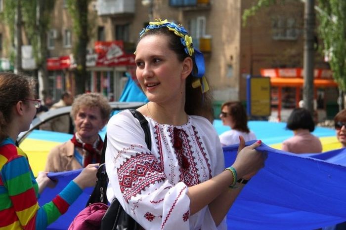 Коммунистическая атрибутика в праздничном шествии уступила место украинским флагам, сине-желтому цвету и вышиванкам.