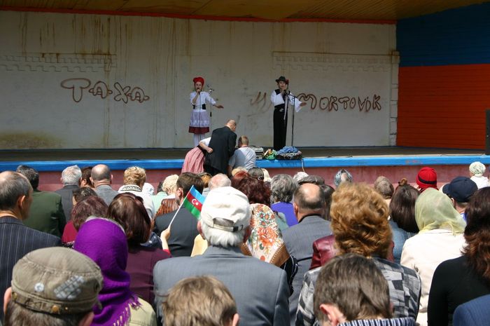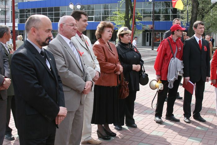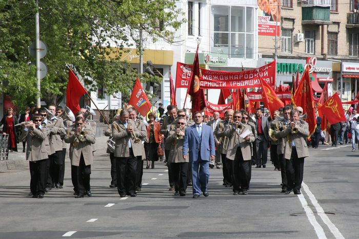 По проспекту шествует колонна с коммунистическими флагами, а в парке организованы танцы для старшего поколения. Да и на праздничные концерты, судя по фото, людей собиралось значительно больше.