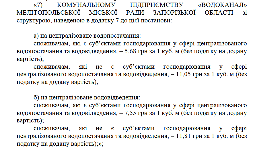 Согласно проекту постановления, мелитопольцы, не являющиеся субъектами хозяйственной деятельности, в скором времени будут платить 11,05 грн. за куб. м за водоснабжение и 11,81 грн. за «куб» за водоотведение. И это без учета НДС.