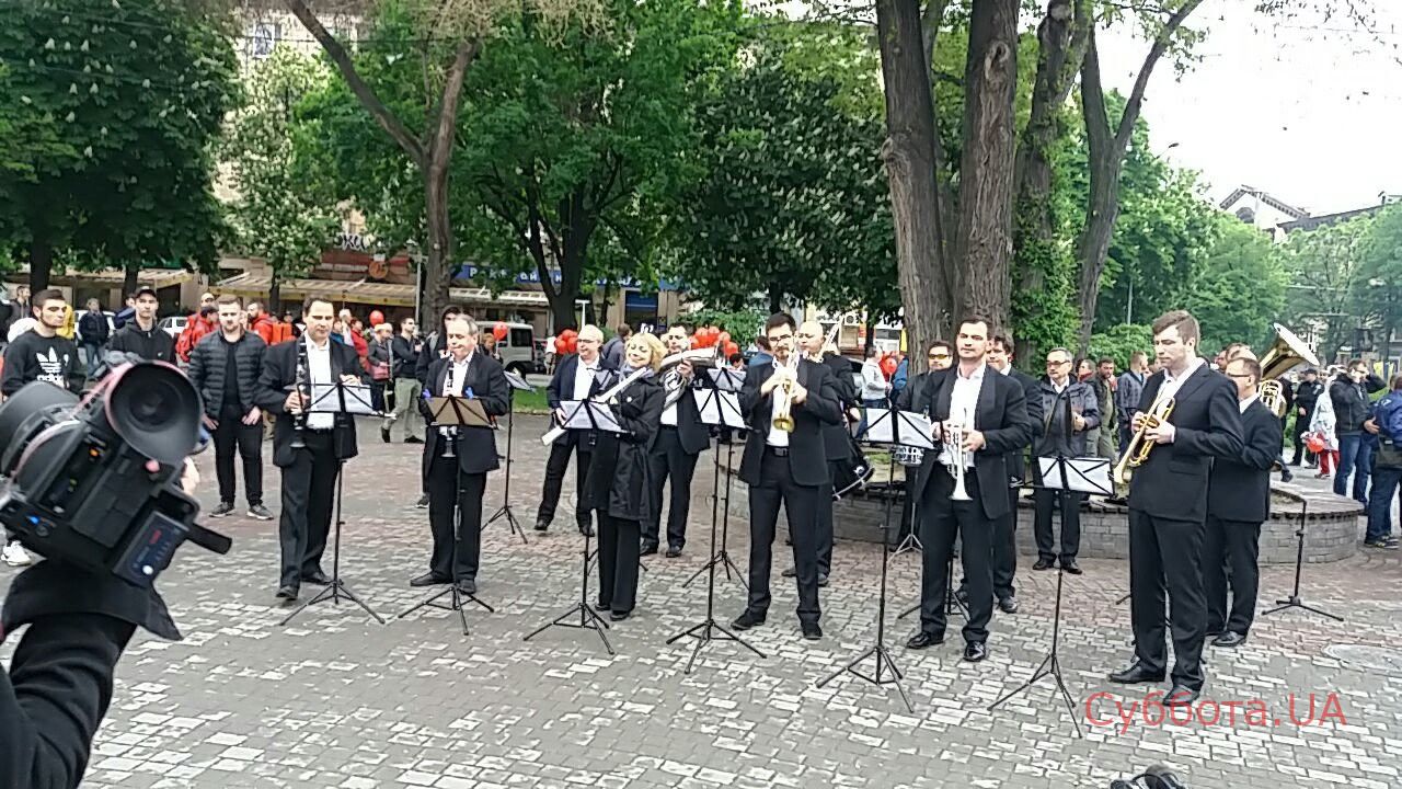 В это же время на площади звучали советские песни, которые исполняли музыканты. Также организаторы акции “Полк Победы” привезли на мероприятие духовой оркестр.