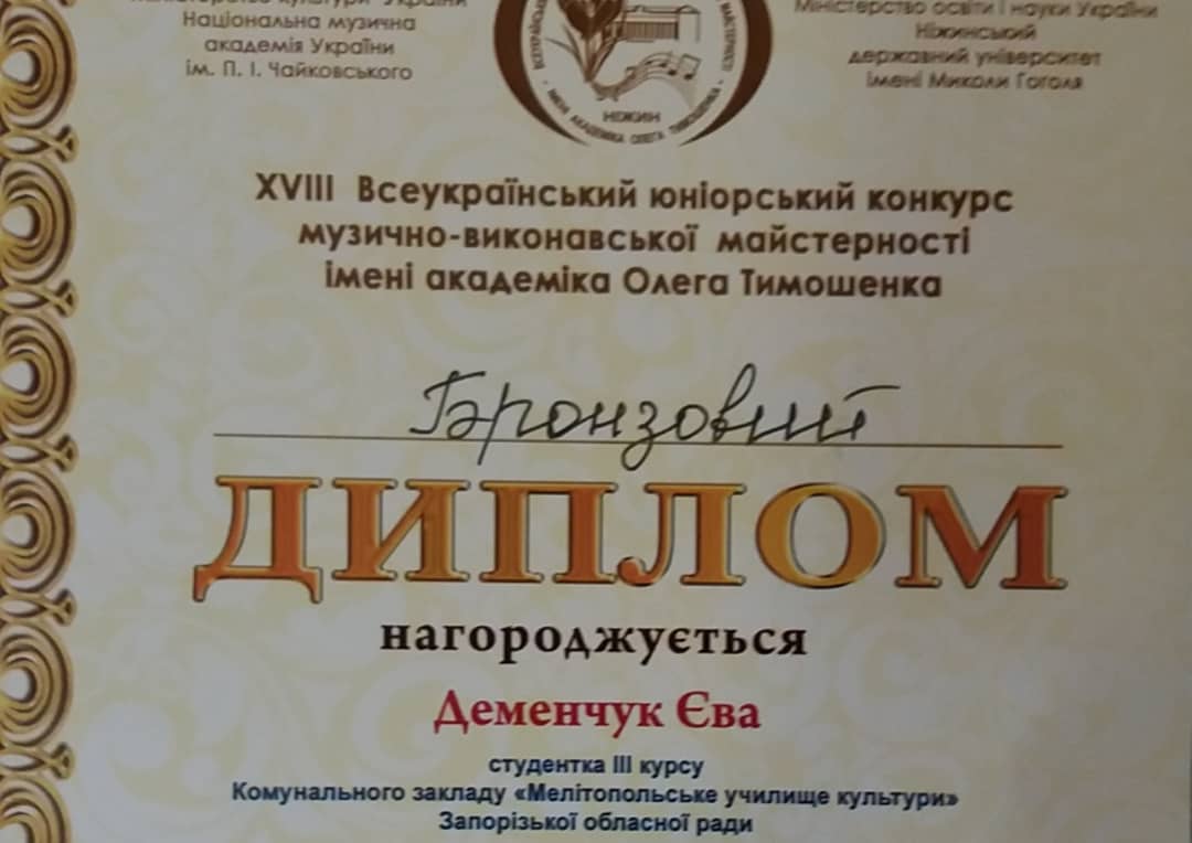 6-8 мая в Нежинском государственном университете им. Николая Гоголя проводился ХVІІІ Всеукраинский юниорский конкурс музыкально-исполнительского мастерства имени академика Олега Тимошенко. Мелитопольцы заняли в нем призовые места.