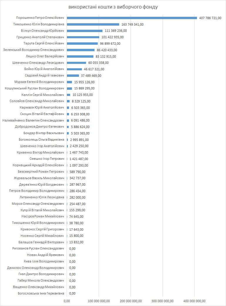 Значительно большие затраты на избирательную кампанию были у пока еще действующего президента Украины Петра Порошенко. Его избирательный фонд составлял до 415 600 000 гривен. Стоит отметить, что эти средства были использованы почти в полном объеме - 407 млн 786 тыс 721 грн. На рекламу в средствах массовой информации штаб Петра Алексеевича потратил чуть больше половины избирательного фонда - 251 908 000 гривен.