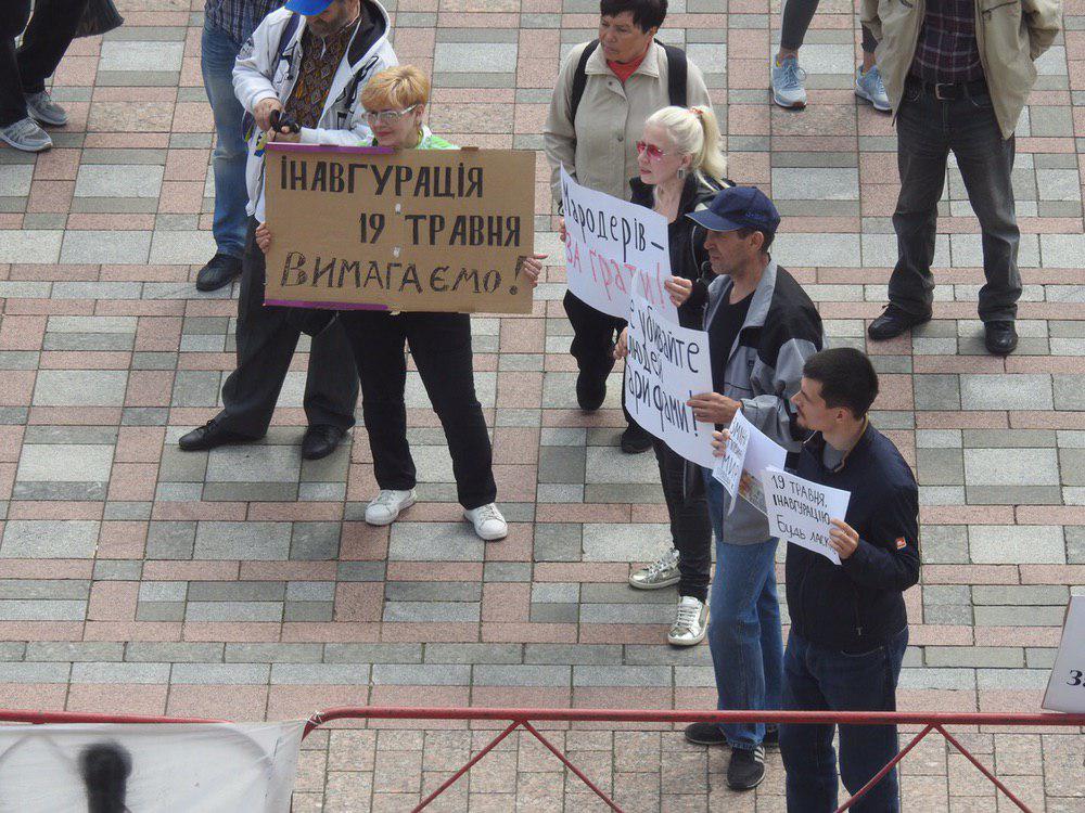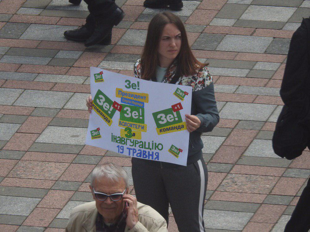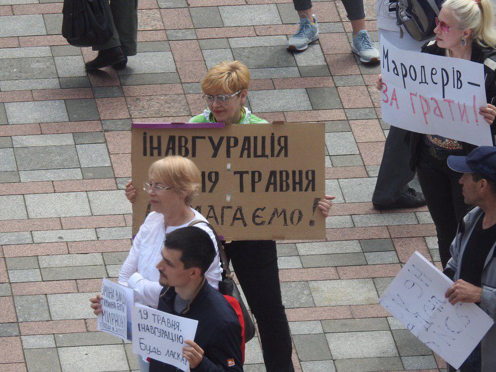 Люди, пришедшие под стены парламента, держат таблички со слоганами: "Инаугурация - 19 мая. Требуем!", "Хватит издеваться, назначьте инаугурацию Зеленского", "Зе президент! Инаугурацию 19 мая!", "Мародеров за решетку!"