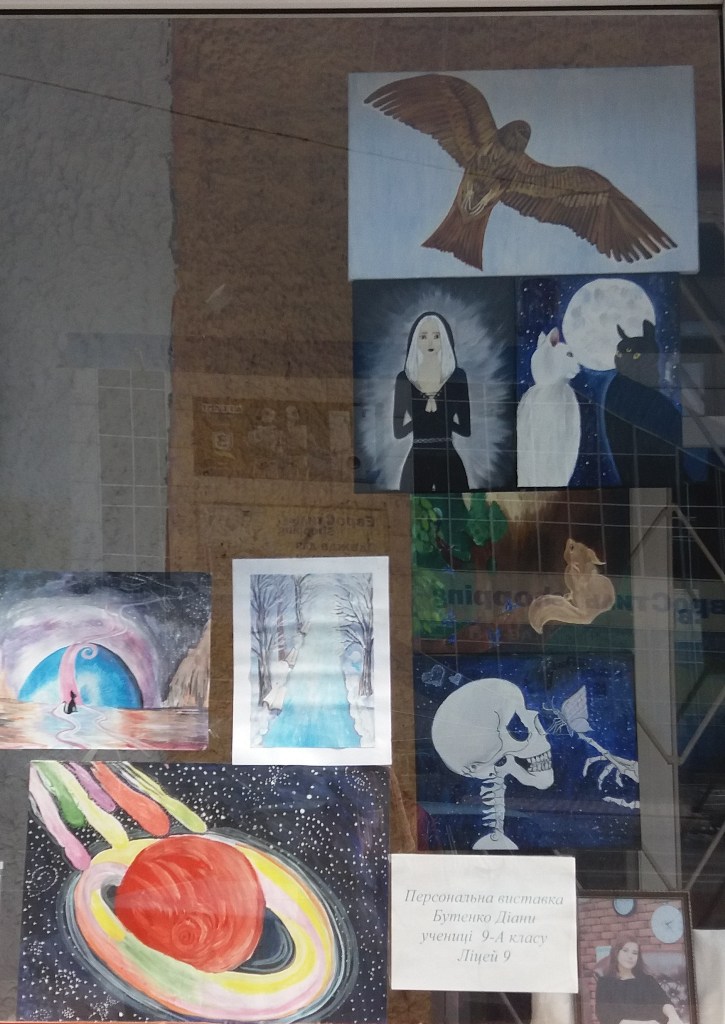 Засветились и заиграли красками картины Дианы Бутенко, которая учится в 9-А классе. Она посещает театральный кружок и изобразительную студию «Веселка». Юной художнице нравится создавать пейзажи, космические фантазии и абстрактную композицию. Диана является лауреатом и победителем городских и областных конкурсов рисунков.
