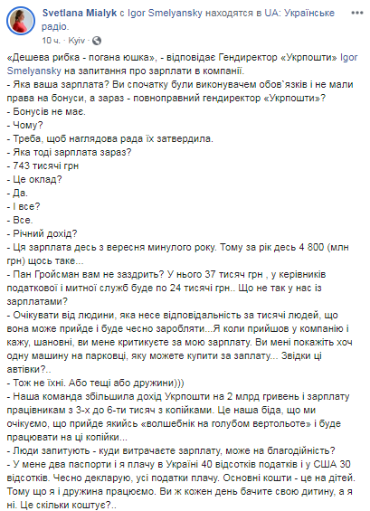 Генеральный директор "Укрпочты" Игорь Смелянский в интервью заявил, что имеет украинский и американский паспорта. Об этом написала журналист Национальной общественной радиокомпании Светлана Мялик на своей странице в Facebook.
