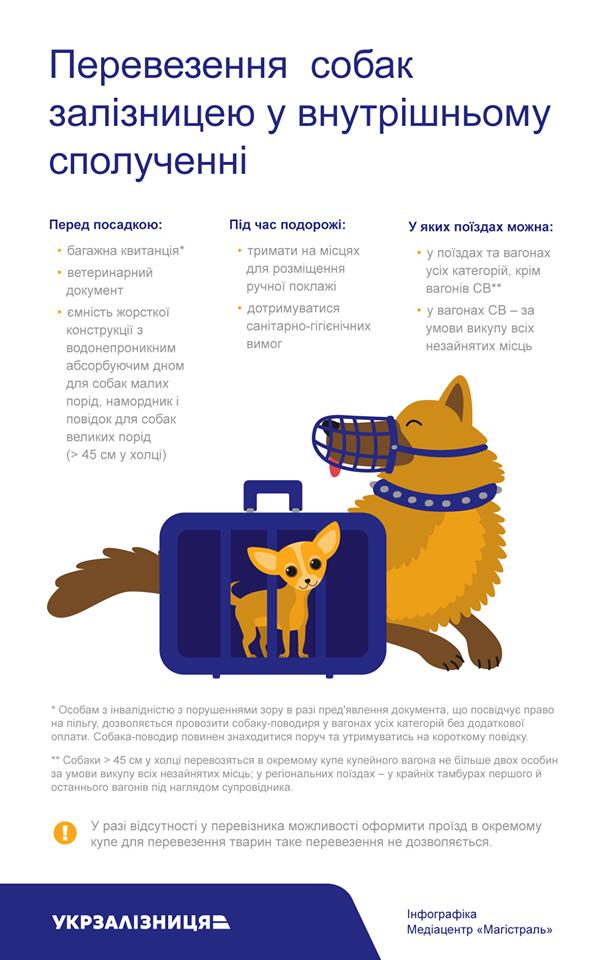 Для собак крупных пород (45 см в холке) нужно приобрести поводок. А во время поездки небольших животных нужно держать в местах ручной клади. Крупных собак перевозят в отдельном купе, не более двух животных. При этом владелец животного обязан выкупить все свободные места в купе.