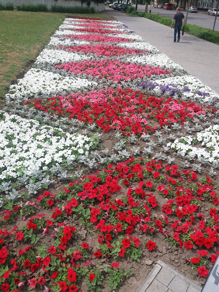 Кстати, в этом году в Мелитополе появилась новая яркая клумба. Цветочную аллею высадили вдоль пешеходной зоны по ул. Гетмана Сагайдачного около памятного знака «Чернобыль». Здесь посадили петунию нескольких цветов и цинерарию, которая пока еще не зацвела. Всего на клумбе посажено более 3 тыс. кустов.