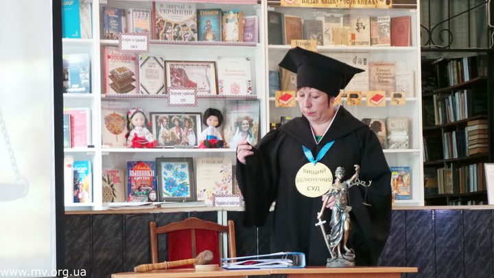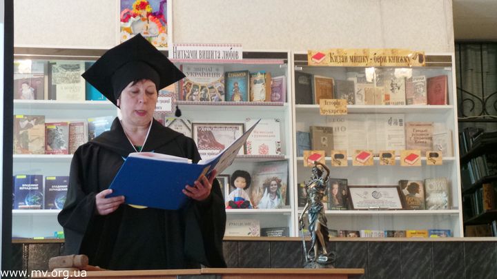 А раз книга написана о женщинах, то С. Авдеенко захотел, чтобы именно женщины судили его творение. Слово автора – закон. Именно поэтому на время читальный зал библиотеки превратился в зал суда, но не простого, а библиотечного. По одну сторону баррикад была сторона защиты: писатель со своим адвокатом, а по другую – сторона обвинения: пострадавшая - гордая независимая женщина с прокурором. А все присутствующие примерили на себя образ присяжных, среди которых был назначен старшина. И, конечно же, не обошлось без главного представителя закона – судьи. В судейском облачении он появился перед гостями мероприятия и с гордостью занял свое кресло.