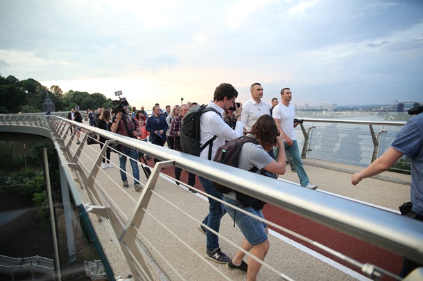 Отмечается, что сперва на мост под звуки праздничного оркестра заехали несколько велосипедистов, а затем на него ступили мэр Киева Виталий Кличко со своим братом Владимиром.