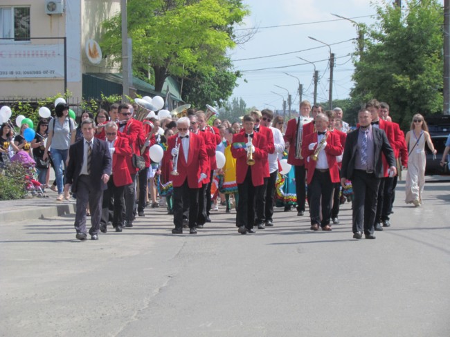 Марш, который возглавлял оркестр Мелитопольского училища культуры, прошел от Дома культуры № 1 по улице Центральной на Центральную площадь поселка.