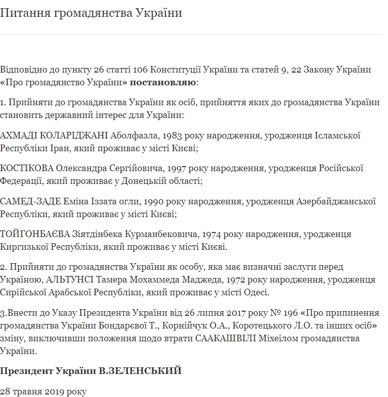 Новый президент Украины Владимир Зеленский вернул украинское гражданство экс-главе Одесской областной государственной администрации Михеилу Саакашвили.