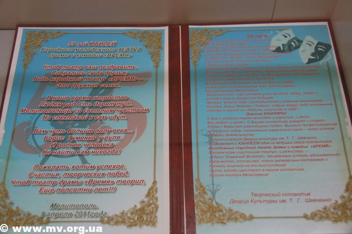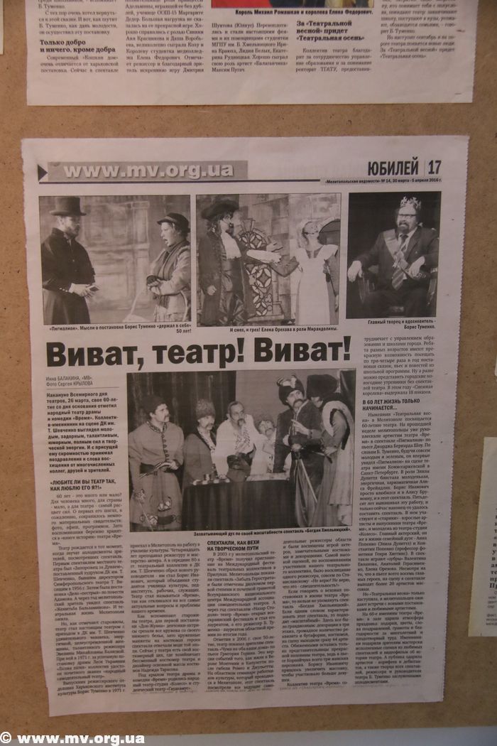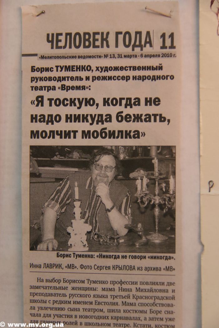 - Борис Иванович преподавал у меня, когда я училась в Мелитопольском училище культуры. Знания он дал своим студентам очень хорошие. С ними мы смело поступали в институты. Б. Туменко был всеобъемлющим. Он был внимателен ко всему: к памяти, к планам, к людям. Его мастерства и любви к театру хватало на всех, - поделилась своими воспоминаниями о мэтре директор ДК им. Т. Шевченко Лариса Стоянчева.