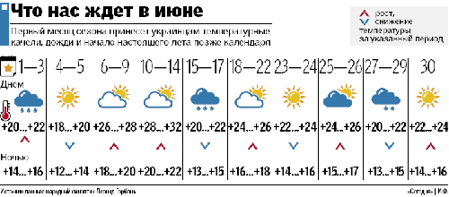 - После прохладной первой недели июня дальше будет жарко и сухо. С середины месяца в Украину придет похолодание, в это время высока вероятность градов, ливней, шквалов, - говорит завотделом климатических исследований и долгосрочных прогнозов погоды УкргидрометеоНИИ НАН Украины Вазира Мартазинова.
