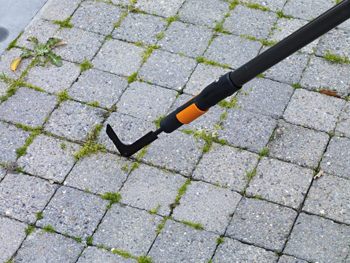 Для работы используют перчатки или специальные Г-образные садовые ножницы для подрезания сорняков (их также называют «корнеудалителями»). С помощью этого инструмента можно достать траву даже в самых труднодоступных местах. При их отсутствии, убрать сорняки можно с помощью тонкого шпателя или монтажного ножа.