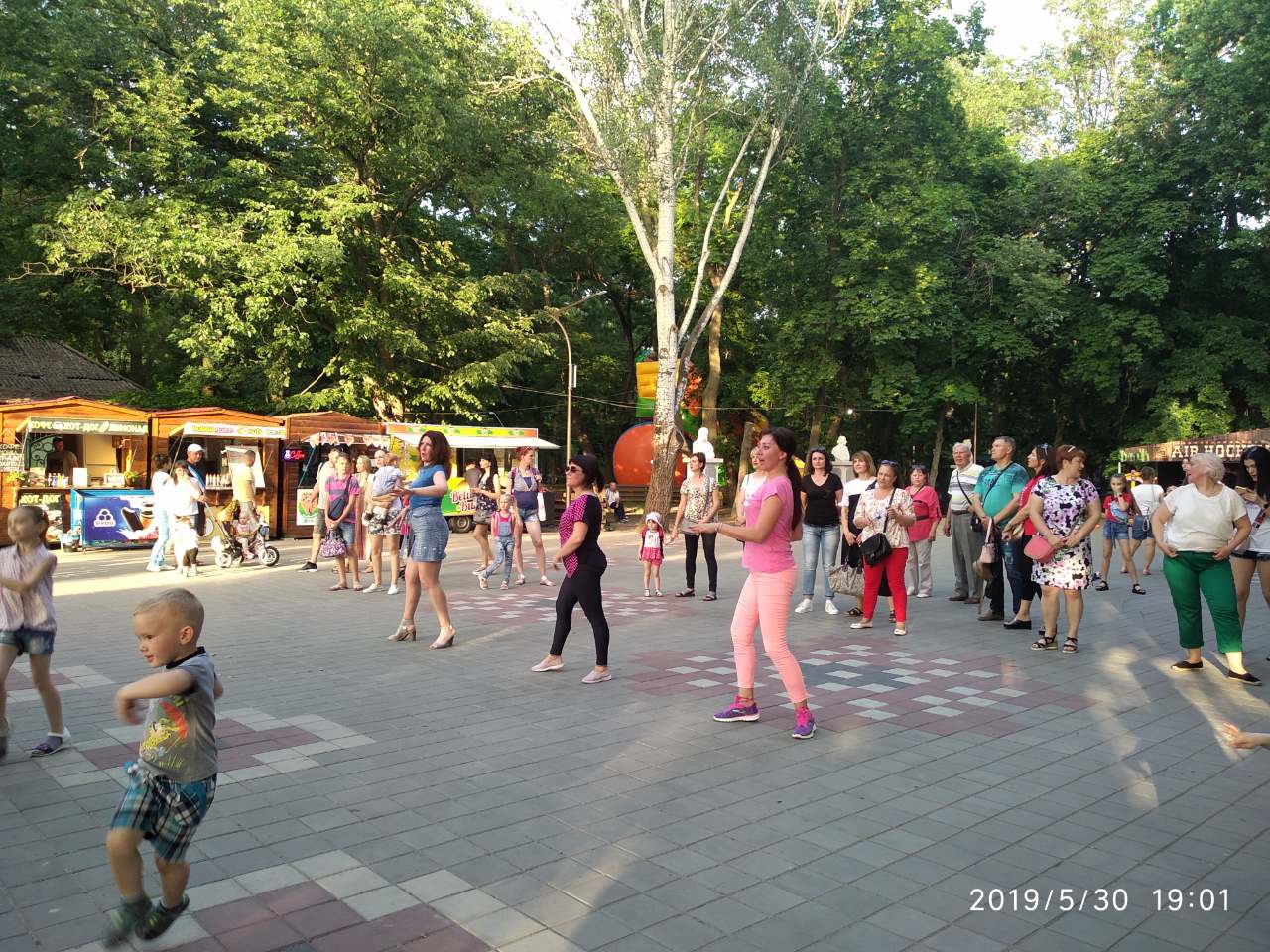 Профессиональные танцоры показывают движения, а отдыхающие парка, которые не постеснялись быть в центре внимания, повторяют их.
