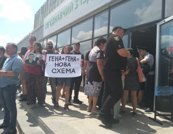 В Харькове возле Дворца спорта, где проходит съезд партии Геннадия Кернеса и Геннадия Труханова "Доверяй делам", устроили акцию протеста, сообщает "МедиаПорт".