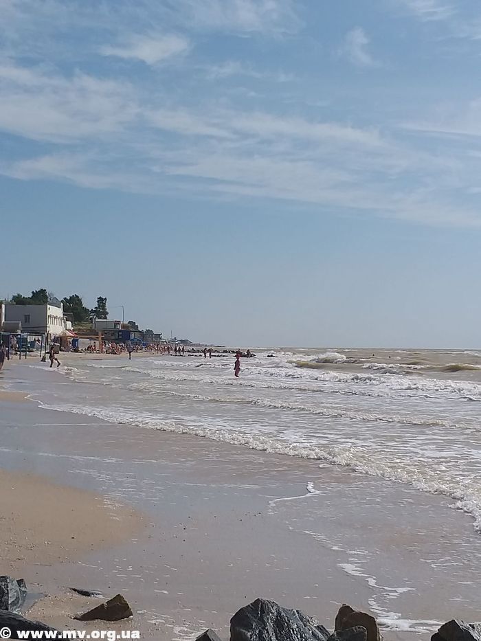 Шторм, разыгравшийся на Азовском море, не разогнал отдыхающих в Кирилловке. Конечно, пляжи не переполнены, но некоторые люди не только загорают, но и купаются в море вместе с детьми.