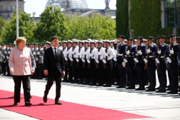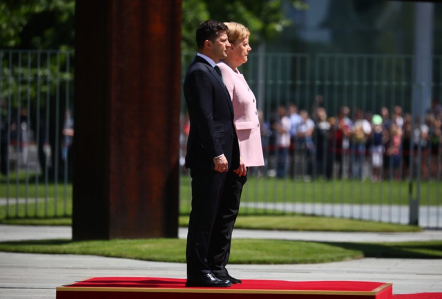 Встреча началась с традиционной торжественной церемонии воинских почестей. Зеленский и Меркель пожали друг другу руки, а затем военный оркестр сыграл гимн Украины.