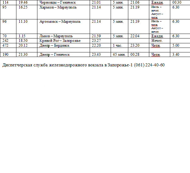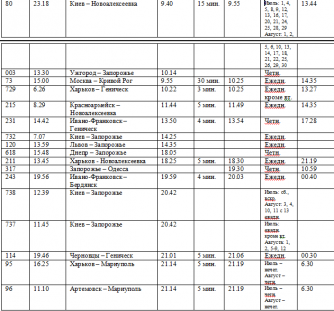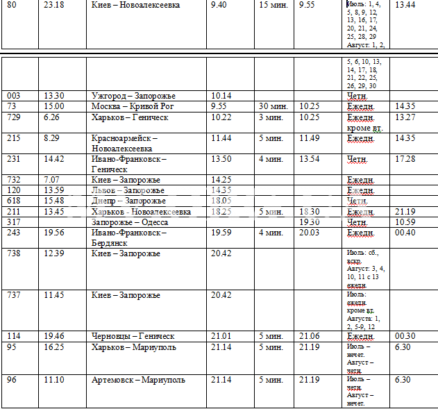 Несмотря на это, расписание иногда подвергается изменениям. Поэтому, прежде чем планировать поездку, стоит позвонить в диспетчерскую вокзала по тел. (061) 224-40-60 или посмотреть наличие билетов на официальном сайте "Укрзалізниці"