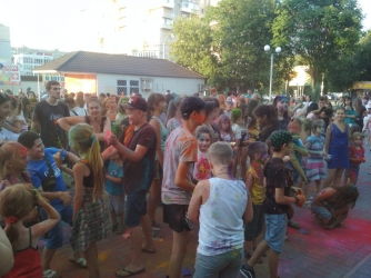 Организаторы обещают участникам фестиваля бесплатные краски, сюрпризы. В рамках мероприятия здесь проходит также мастер-класс по зумба-фитнесу.