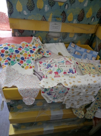 Главное, что отличает новые боксы, - увеличенный запас детской одежды. Так, теперь в коробке три шапочки, 7 бодиков с коротким рукавом, столько же с длинным и 7 практичных «человечков». Тогда как ранее было по две вещи каждого наименования. Все одежки представлены в четырех размерах: 56 (1), 62, 68 и 74 по два каждого. Шапочки на малышей 0-3 мес., 3-6 и 6-12. Также в наборе остались ползунки, детские сорочки с длинным рукавом и носочки.