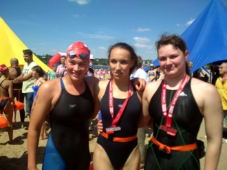 Надежда Иванова, 18-летняя спортсменка из Запорожья (на фото в центре), победила среди женщин в заплыве на 1 км через Днепр.