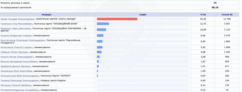Например на 74-ом округе Геннадий Касай набирает более 44% голосов, а Игорь Чумаченко от «Оппоблока» только 12,74%, будучи на втором месте. Обработано почти 58% голосов.