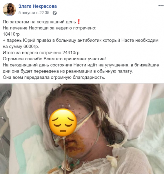 Волонтер добавляет, что состояние девушки немного улучшилось, поэтому в ближайшее время ее переведут в обычную палату вместо реанимационной.