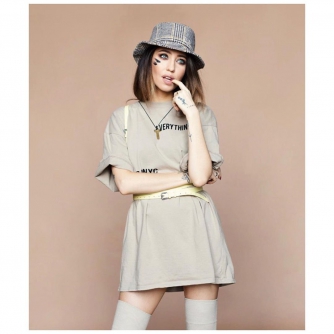 Солистка «Время и Стекло» показала фото в стильном образе – коротком платье миндального оттенка с поясом, который подчеркну ее тонкую талию. Она дополнила смелый лук чулками молочного цвета и клетчатой шляпкой.