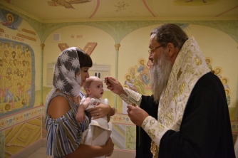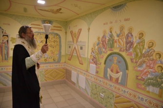 Как рассказал иерей Роман Васильченко, крестильня при Свято-Георгиевском храме была построена достаточно давно. Но только сейчас она приобрела желаемый облик. Теперь стены украшают сюжеты из Евангелие, икона «Отче наш», текст обязательных для прочтения крестными молитв «Отче наш» и «Символ веры» и пр. На роспись ушло почти полгода. Работы выполнили преподаватели и ученики иконописной школы, которая существует при храме.