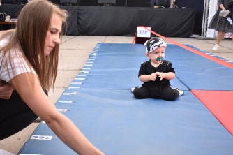 В рамках празднования Дня города было организовано мероприятие и для ловких детей. Соревновались семь детей - кто первый доползет до финиша. Мамы и папы помогали им ускориться, демонстрируя и игрушки, и телефоны, и книги, и часы - все, чтобы их маленькие спортсмены были самыми быстрыми.