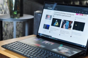 Особенностью ноутбука является его система из двойных дисплеев: основной 15,6-дюймовый обладает OLED-панелью с разрешением 3840х2160 пикселей, а второй 14-дюймовый построен на базе IPS ScreenPad Plus С сенсорным управлением и разрешением 3840х1100 пикселей (32:9).