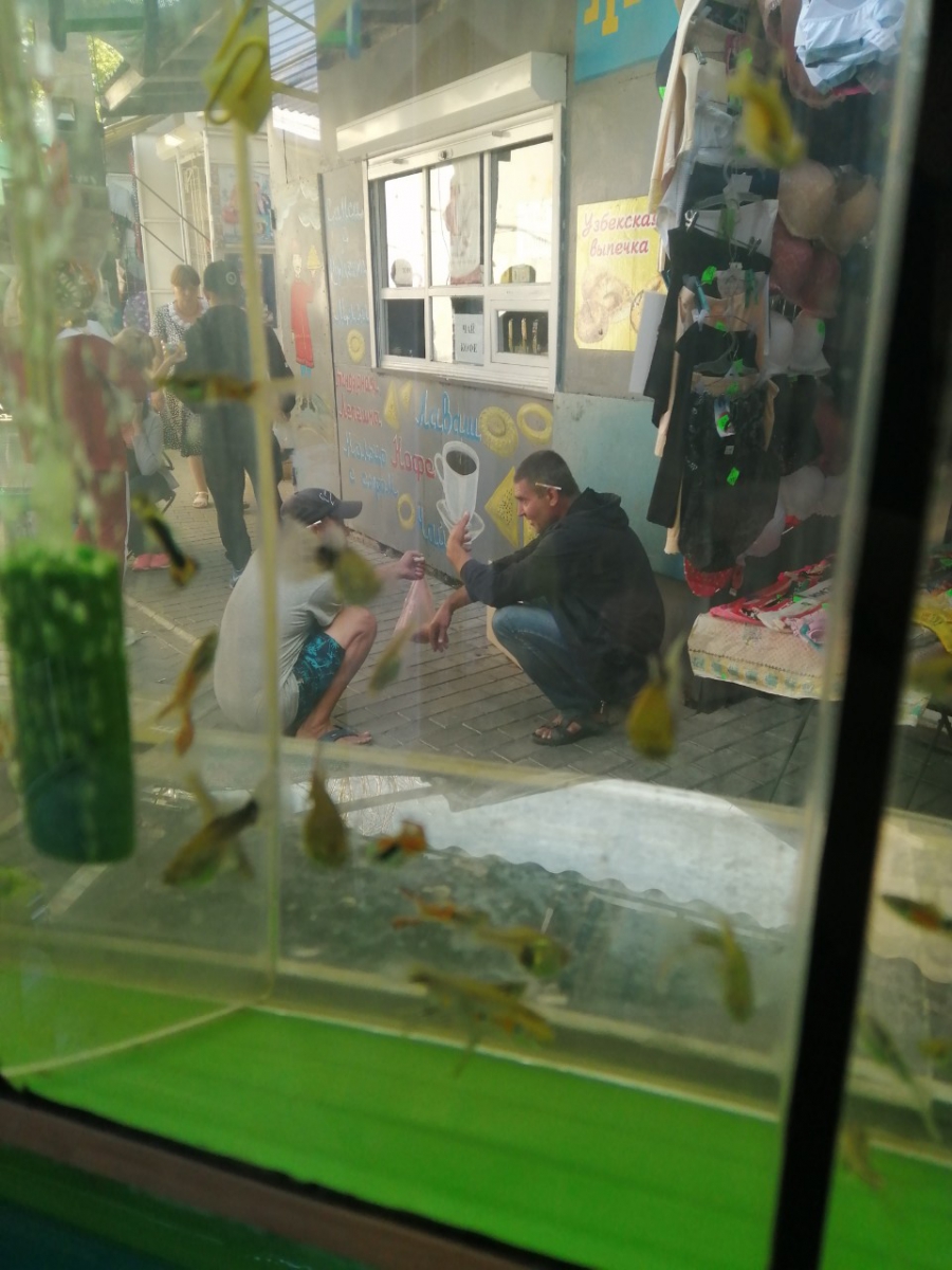 Батискаф «Узбекская кухня» торгует в основном совсем не узбекским суррогатом на розлив. От его клиентов страдают продавцы соседних торговых точек. Так, обратившаяся к нам владелица батискафа Анастасия торгует на рынке аквариумными рыбками. Она обнаружила на днях, что на ее батискаф кто-то справил малую нужду.