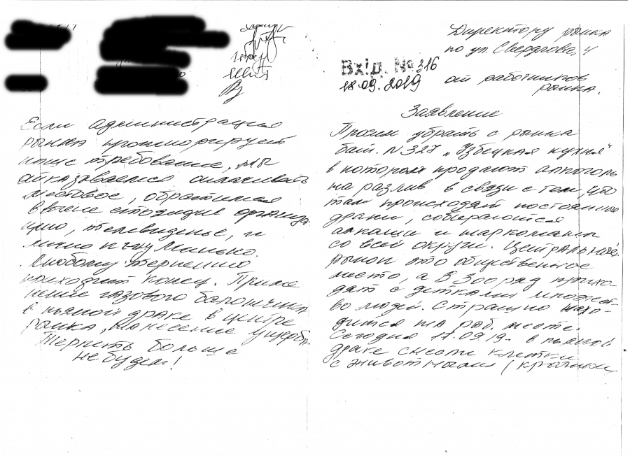 Тем временем произошел инцидент, переполнивший чашу терпения рыночников. 18 сентября между клиентами наливайки произошла драка с применением газового баллончика. Во время потасовки была разбита клетка с кроликами у одной из торгующих. Люди написали коллективное заявление на имя директора рынка с требованием закрыть торговую точку. Под заявлением свои подписи поставили десятки торгующих.
