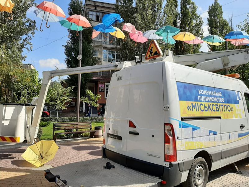 В сквере Дружбы народов, который расположен на ул. Брив-ла-Гайард, сегодня коммунальщики приступили к демонтажу разноцветных зонтиков.