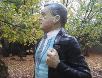На кадрах видно, что памятник раскрасили, "одев" на него черный костюм с гербом Украины. Лицо попытались сделать похожим на Порошенко.