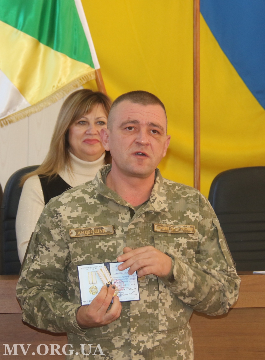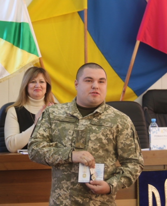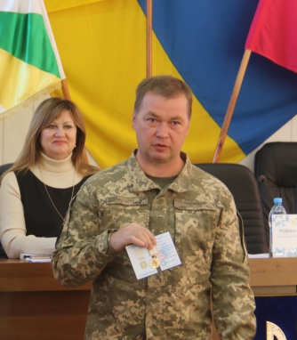 Единственной женщиной, которая сегодня вышла за наградой, стала супруга командира батальона территориальной обороны Александра Зуева Светлана. Она приняла медаль вместо мужа, который проходит службу в зоне проведения Операции Объединенных сил.