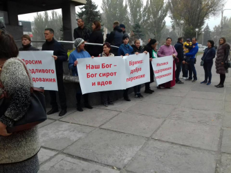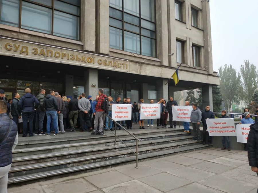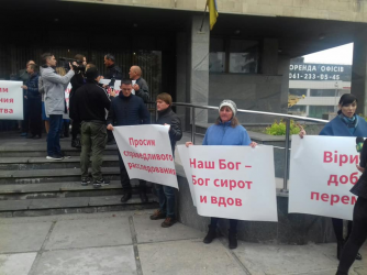Под стенами Запорожского апелляционного суда, где решается вопрос об изменении меры пресечения директору Приазовского интерната, которого обвиняют в торговле людьми, собрался пикет из верующих.