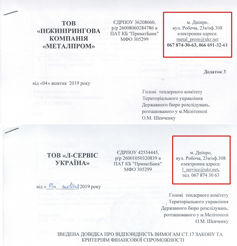 Как сообщил портал «Наші гроші Запоріжжя», ООО "Л-Сервис Украина" и ООО "Инжиниринговая компания "Металпром " на тендере в качестве контактного указывали одинаковый номер телефона. Кроме этого, согласно метаданным, изображения, представленные в составе тендерной документации были созданы на одной компьютерной технике. Также в документах фирмы указывают одинаковый адрес своей регистрации: г. Днепр, ул. Рабочая, 23в, офис № 308.