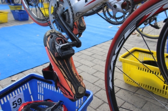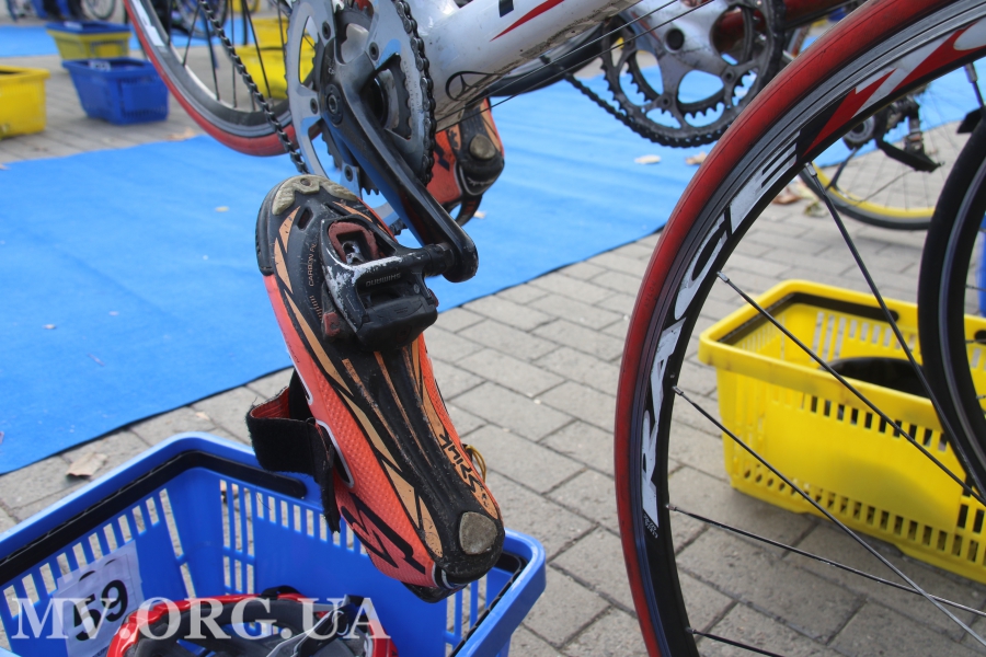 Кстати, в целях экономии времени обувь, в которой участники триатлона едут на велосипеде, крепится к велосипеду. Кто-то прикручивает ее к педалям болтами, кто-то подвязывает шнурками. После первого забега всего секунда уходит на то, чтобы сбросить беговые бутсы, надеть шлем и уже на ходу впрыгнуть в сменную обувь.