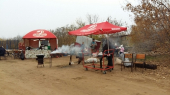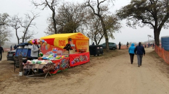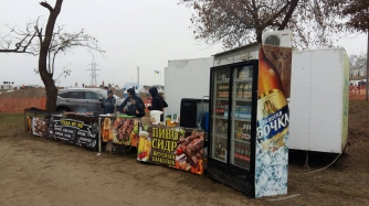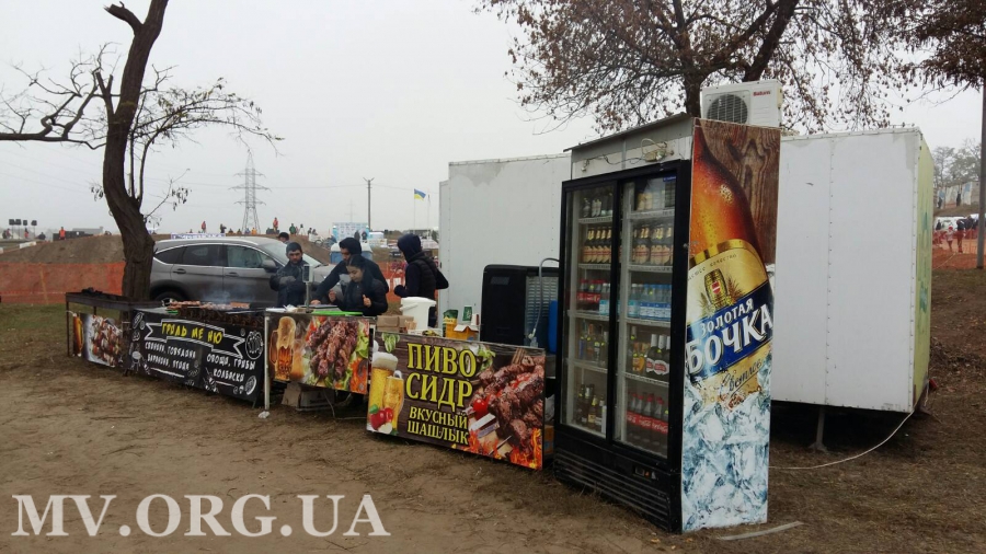 Там же установлены палатки с сувенирами, шашлыком, разносолами. Можно согреться кофе или чаем, но есть и пиво.