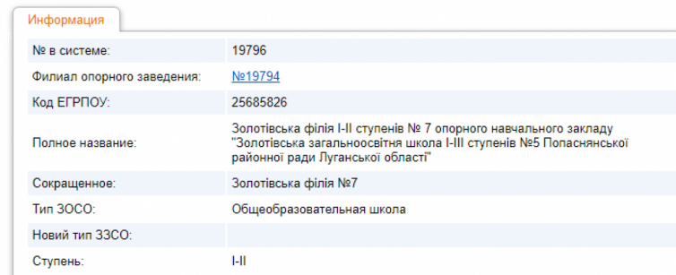 На сайті Інформаційної системи управління освітою зазначається, що Золотівська загальноосвітня школа І-ІІ ступенів №7 Попаснянської районної ради Луганської області була дійсно перейменована на Золотівську філію І-ІІ ступенів № 7 опорного навчального закладу "Золотівська загальноосвітня школа І-ІІІ ступенів №5 Попаснянської районної ради Луганської області".