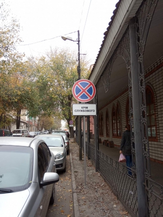 По нечетной стороне улицы такие знаки расположены сразу за перекрестком М. Грушевского и Интеркультурной, потом после выезда со двора казначейства, потом после выезда со двора мэрии. Возле каждого из знаков внизу расположена табличка "Крім службового" .