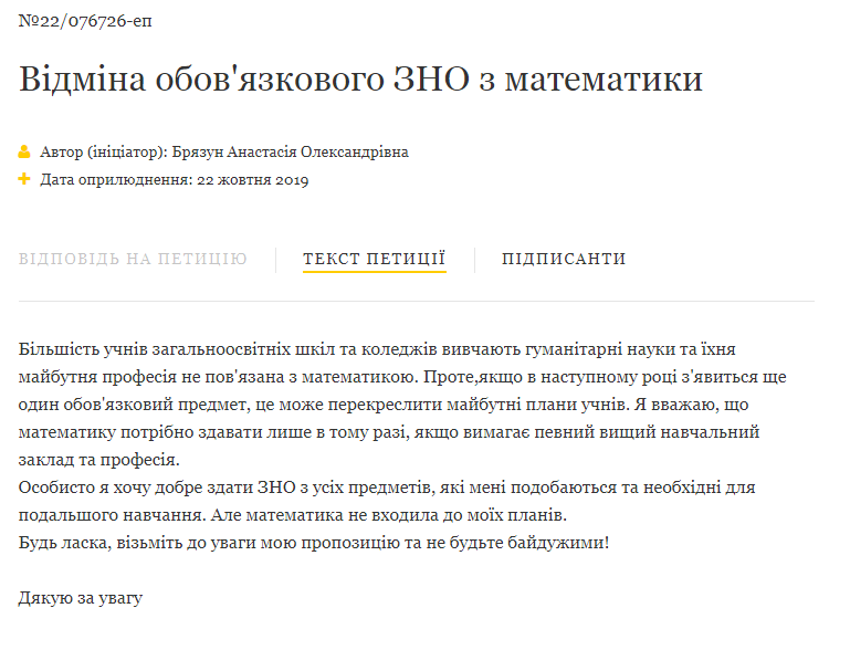 Начиная с 2021 года ВНО по математике станет обязательным для поступления в вузы. Соответствующее решение ранее приняла коллегия Министерства образования и науки Украины. В связи с этим на сайте Президента Украины появилась электронная петиция об отмене обязательного ВНО по математике. Её автором стала школьница из города Пологи Запорожской области Анастасия Брязун.