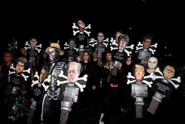 Некоторые отнеслись к празднованию Хеллоина с креативом, заложив в костюм подтекст. Люди надевали маски политиков и известных личностей, приходили на работу в костюме, или создавали действительно ужасающие образы.