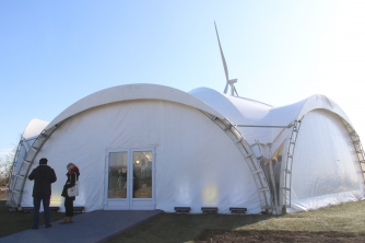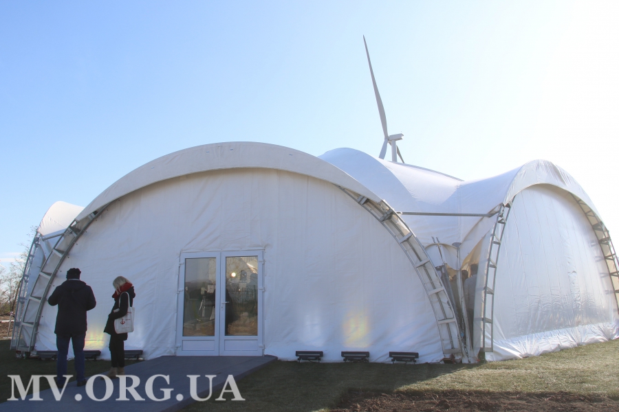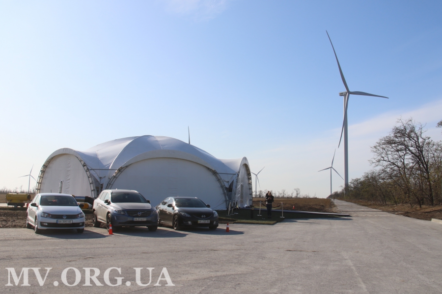 Подъезжаем к административному зданию ВЭС. Рядом с ним уже подготовлен большой шатер, куда приглашают всех съехавшихся гостей. Здесь все организовано на высоком уровне – отопление, работает гардероб, хостес улыбаются и радушно встречают гостей, по всему шатру расположены столики и диванчики.