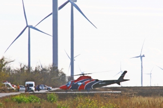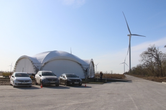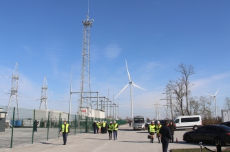 На подъезде к самой ветроэлектростанции установлены так называемые «пропускные пункты». Первыми нас встречает охрана, которая, завидев нашу машину с логотипами и заглянув в салон, сообщает, что мы есть в списке гостей, а поэтому пропускает нас дальше.